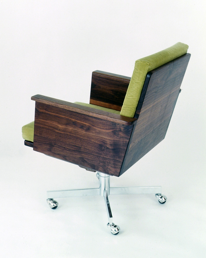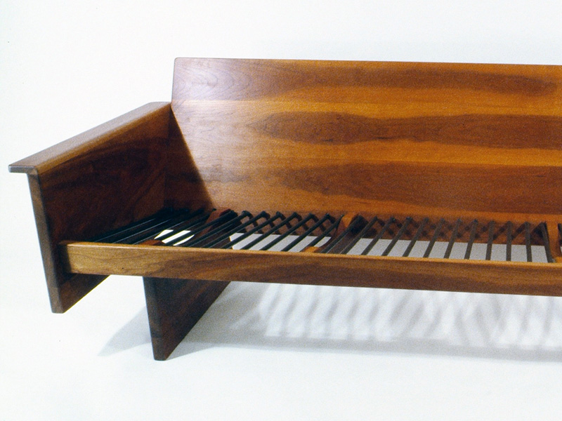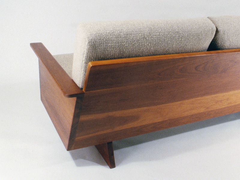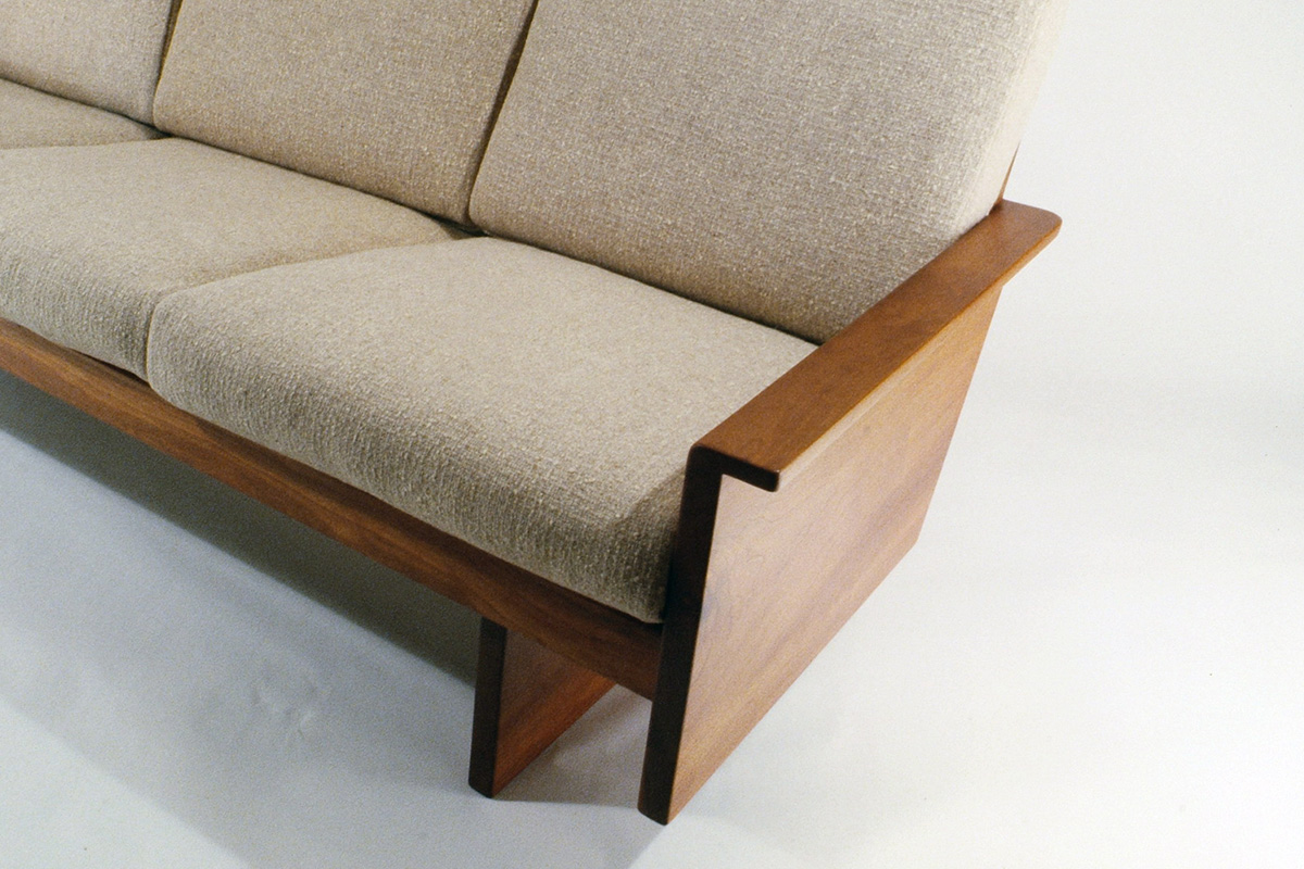 The S814 three-seat, sled leg sofa in cherry or walnut with plush cushions and finished solid wood back is a statement piece in any room. A perfect match of hardwood and form, this sofa also came in a two-seat version, S813. Many customers who purchased the S814 included the S813 in their order to create a sectional sofa sitting experience in their homes.